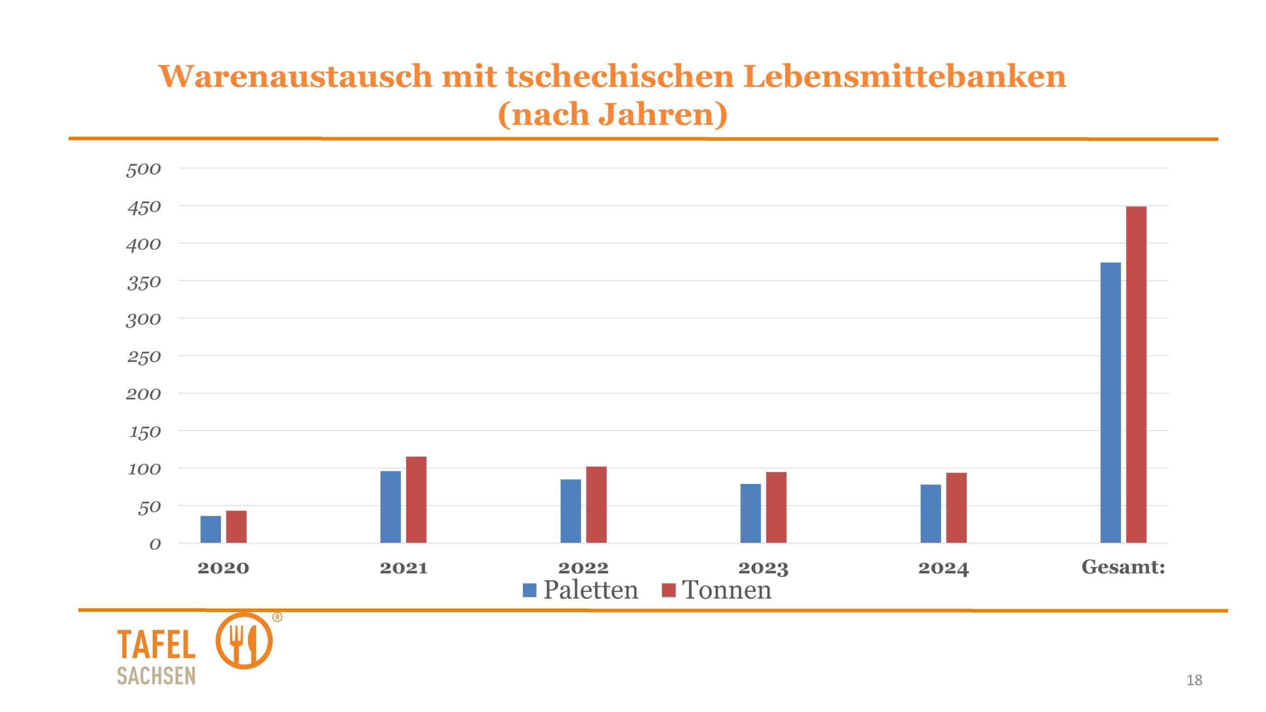 Seit nun sechs Jahren arbeitet der Landesverband Tafel Sachsen e.V. mit der Ceska federace potravonovych bank, z.s., in Prag intensiv zusammen und tauscht beiderseitig überschüssige, hochwertige Lebensmittel aus. Unterdessen wurden in Projekten strukturelle Ratschläge verfolgt. So gelang es u.a. in der tschechische Partnerorganisation eine Erweiterung bei der Organisation der Spendenübergaben an die Endverbraucher vorzunehmen. Das hatte vorerst in der Hauptstadt Prag dazu geführt, dass vermehrt bedürftige tschechische Bürgerinnen und Bürger direkt Anteil an Lebensmittelspenden erhalten. Im Rahmen von bisher fünf gemeinsamen Workshops und Tagungen haben sich im grenznahen Bereich agierende Tafeln auf sächsischer Seite zu Kooperationen mit den Lebensmittelbanken auf der nordböhmischen Seite positioniert. Die Partner tauschen regelmäßig unter Leitung der beiden Dachverbände ihre Erfahrungen aus und entwickeln Projektideen zur Ausgestaltung des weiteren Zusammenwirkens.
